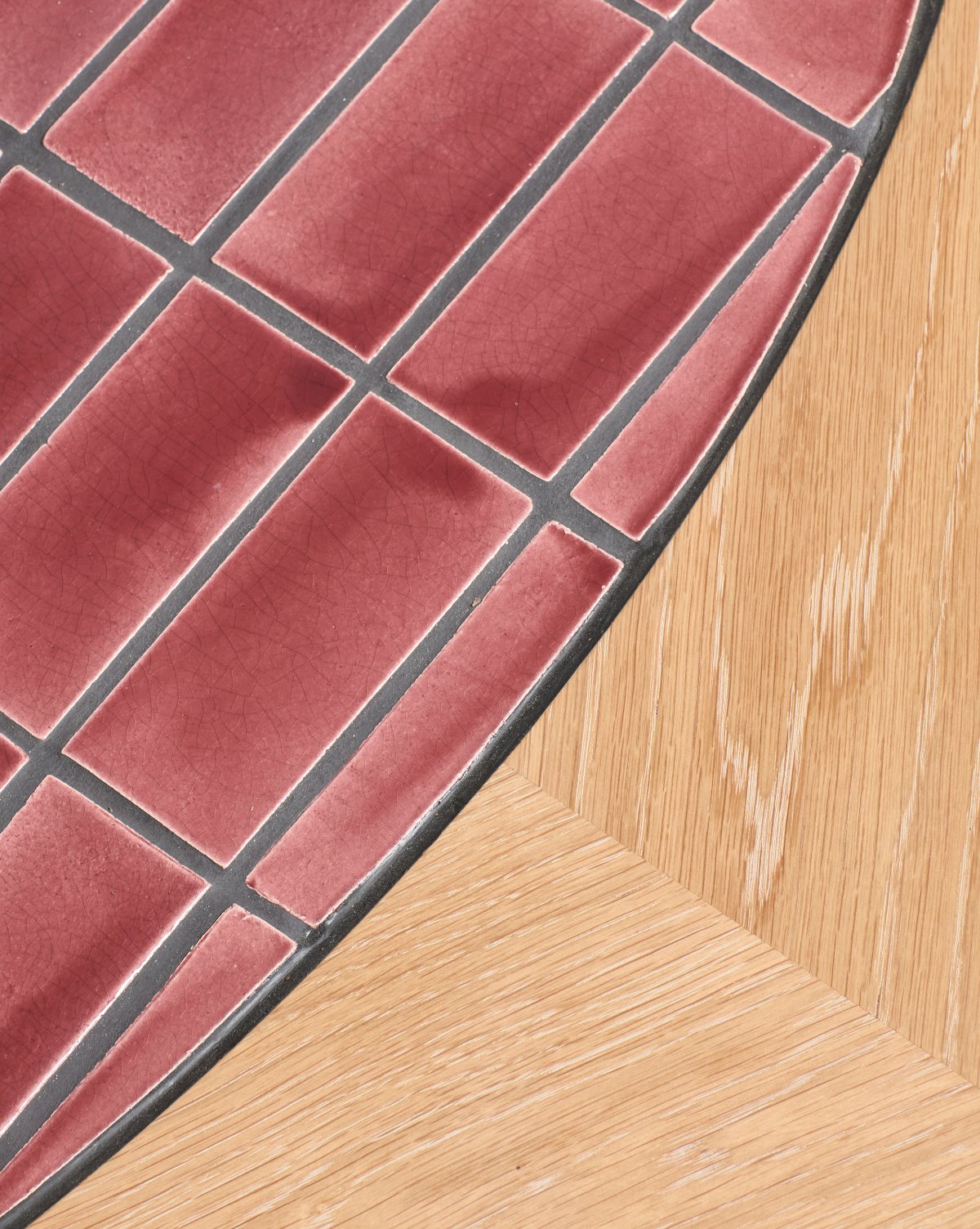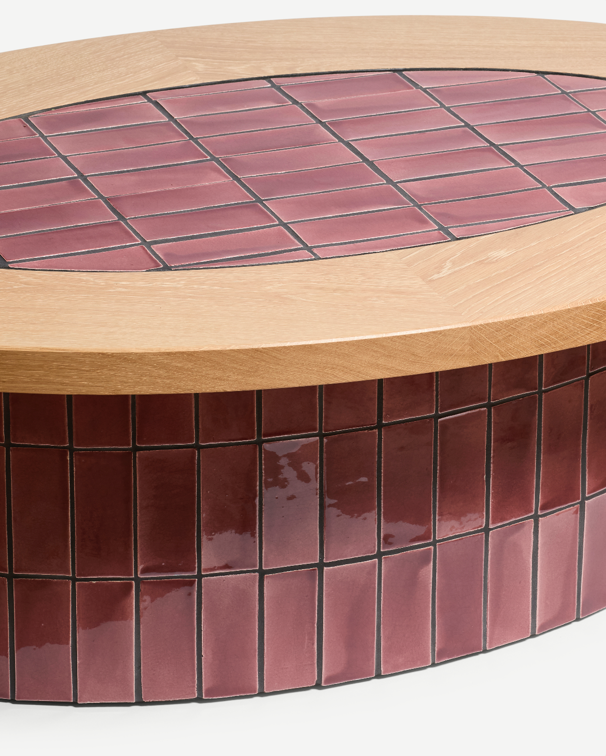 Designed by Matthew Raw, the Welcome Coffee Table in Berry takes inspiration from the historical use of tiles on building facades. This low-profile coffee table is an evolution of Raw's existing Welcome Collection. It features a solid oak top and a single, fully tiled cylindrical column at its base, giving the impression that the column emerges through the timber. An oval-shaped tiled area is also inlaid into the surface of the oak top. The table uses hand-built tiles—identical in proportion to those in the original collection—which are finished with a range of custom glazes.