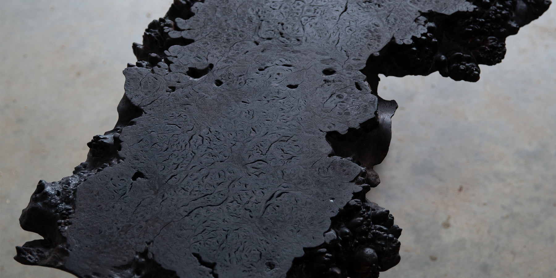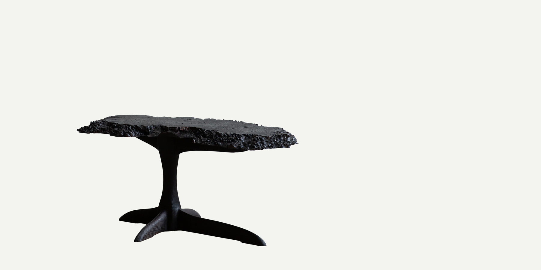 The pedestal side table features a single piece top sculpted from English Burr oak. The edges display the natural contours of burr oak nearly all the way around the piece. Formed from a rare piece of wood, the surfaces have been charred and brushed, with a sculpted base carved from English Oak.