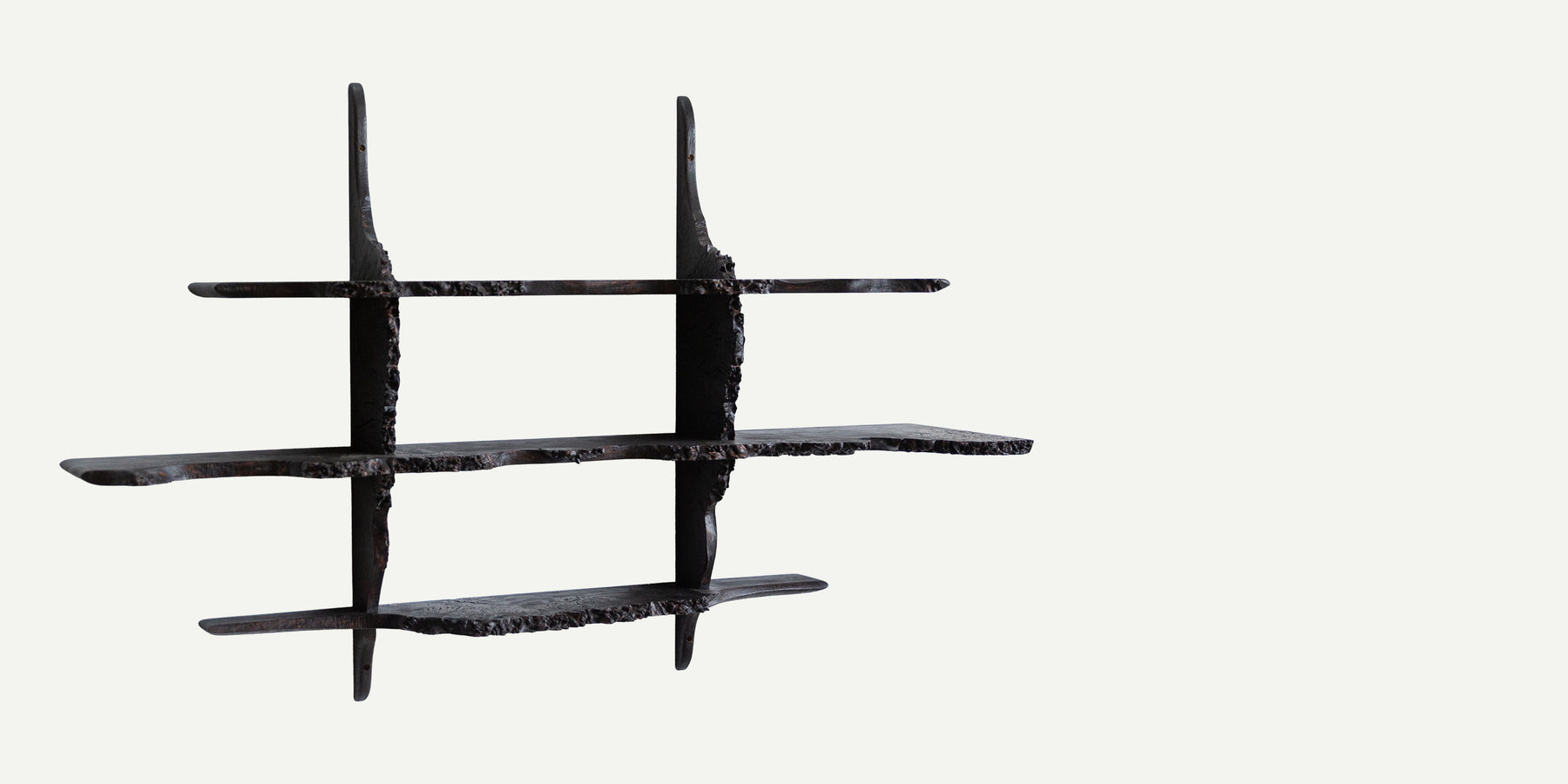 The wall piece comprises five individual elements of English burr oak, each retaining its natural edges and finished with a charred surface. The composition brings together pieces selected for their distinct grain and character. Each section is shaped in response to the structure of the timber, with the final arrangement determined through the process of making.